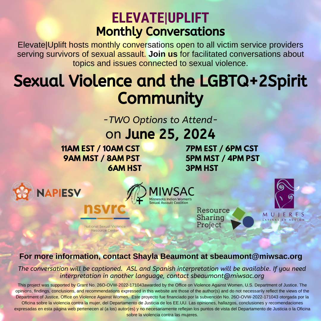 Elevate|Uplift is a National Technical Assistance Project that consists of National Technical Assistance Organizations, including National Asians and Pacific Islanders Ending Sexual Violence, The Resource Sharing Project, National Sexual Violence Resource Center and Minnesota Indian Women's Sexual Assault Coalition. The goal of our Community Conversations is to connect and discuss topics with participants who are working in the Sexual Violence Movement. To discuss and problem solve or reach out for more education, resources and trainings. June's topic titled: Sexual Violence and the LGBTQ+2Spirit Community